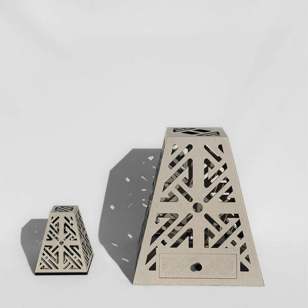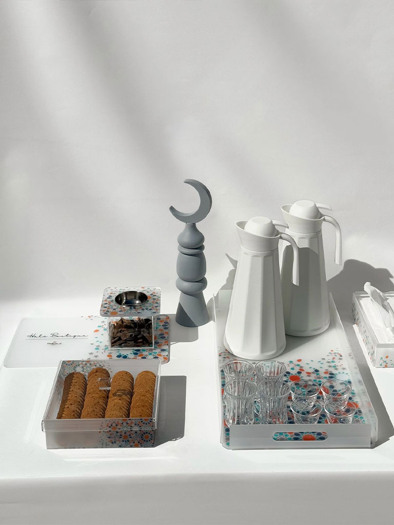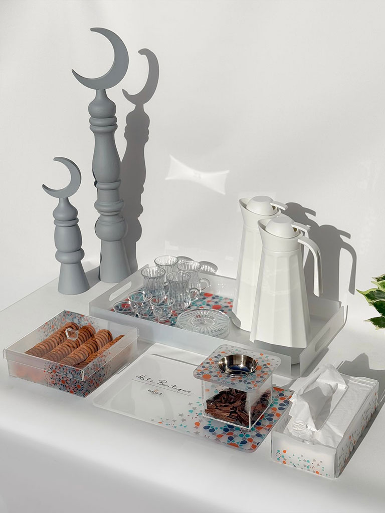 Set of Tray, tissue boxe, madkan and sweet box with modern design. Can have family name printed in Arabic or English.