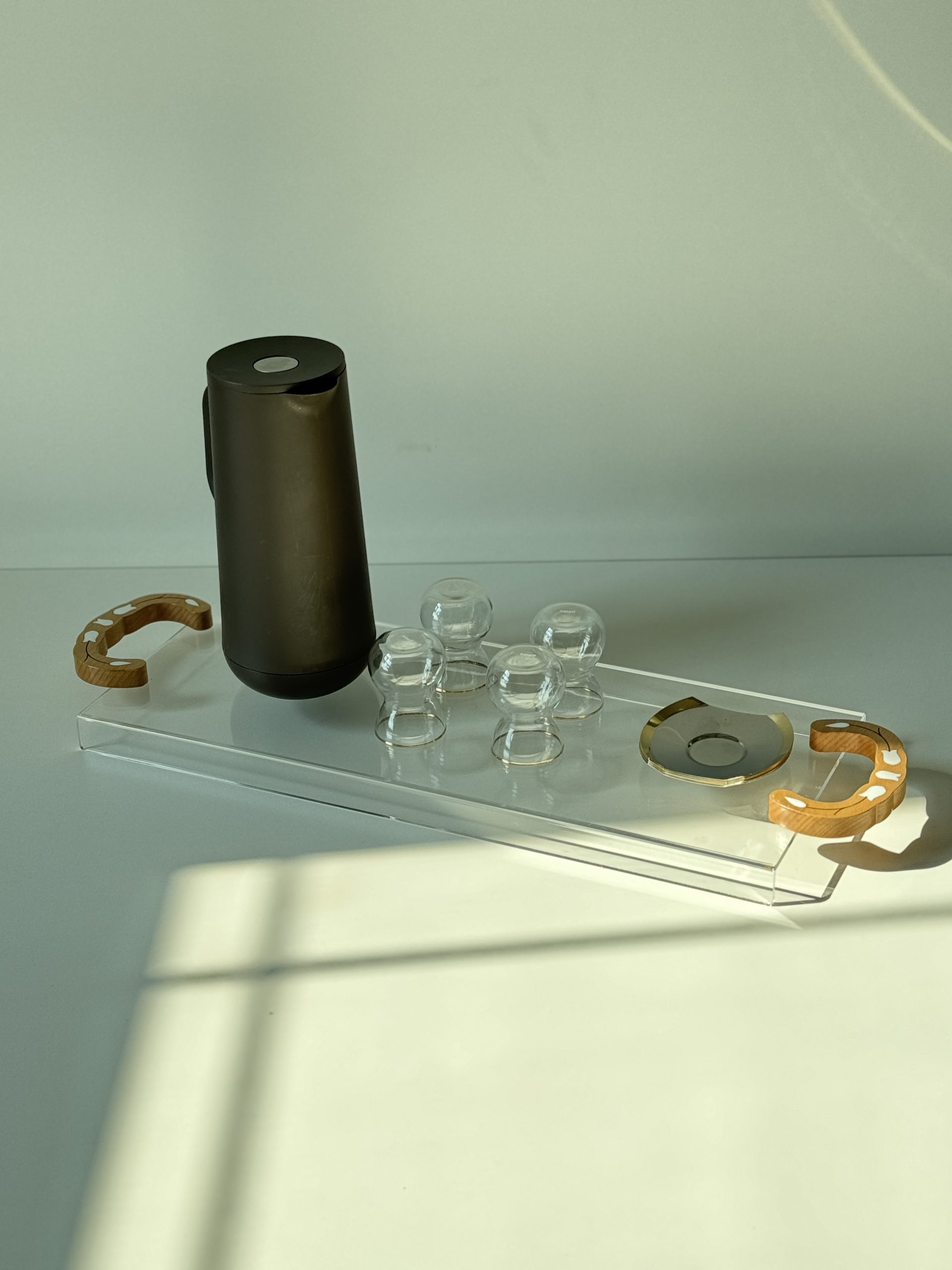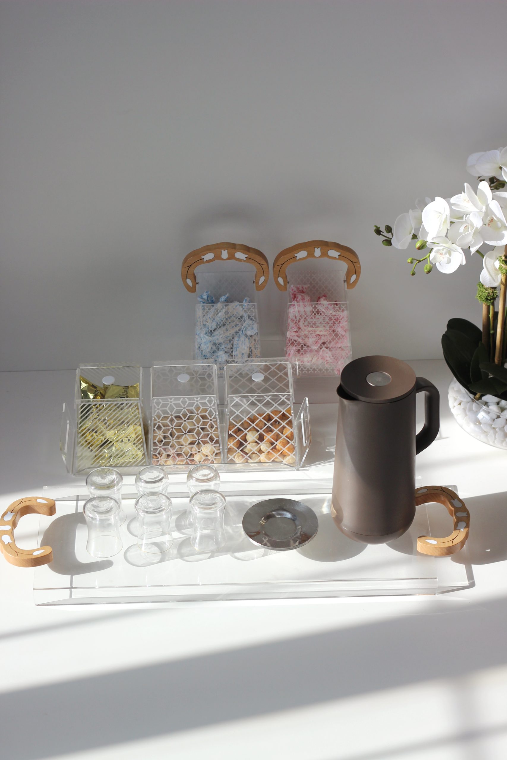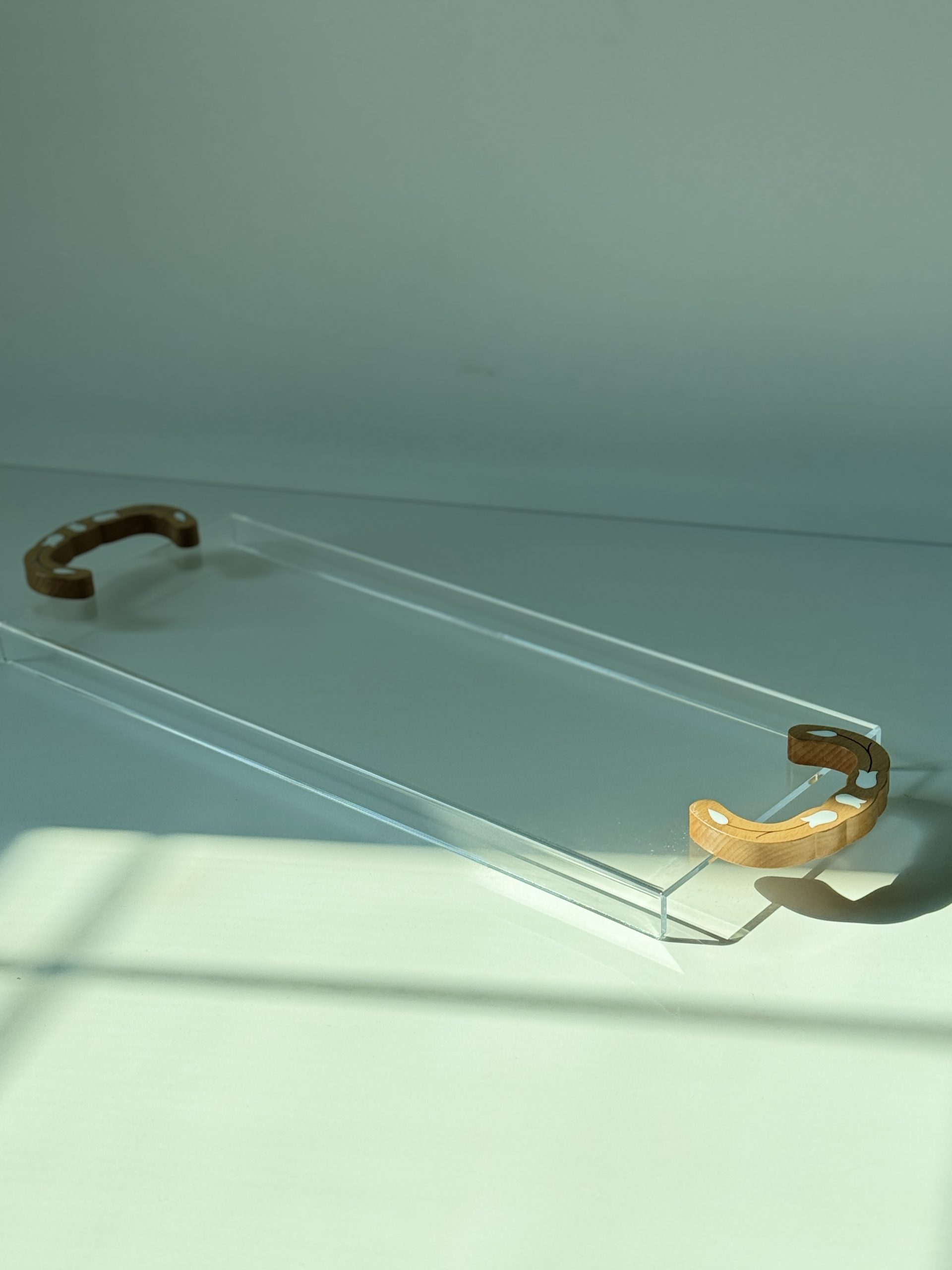 Introducing our Acrylic Tray with Wooden Handles – a marriage of modern sophistication and rustic charm, designed to elevate your serving and organization experience. Crafted with precision, the clear acrylic base of the tray provides a sleek and contemporary foundation for your items. The standout feature of this tray is its carefully selected wooden handles. These handles, crafted from high-quality wood.