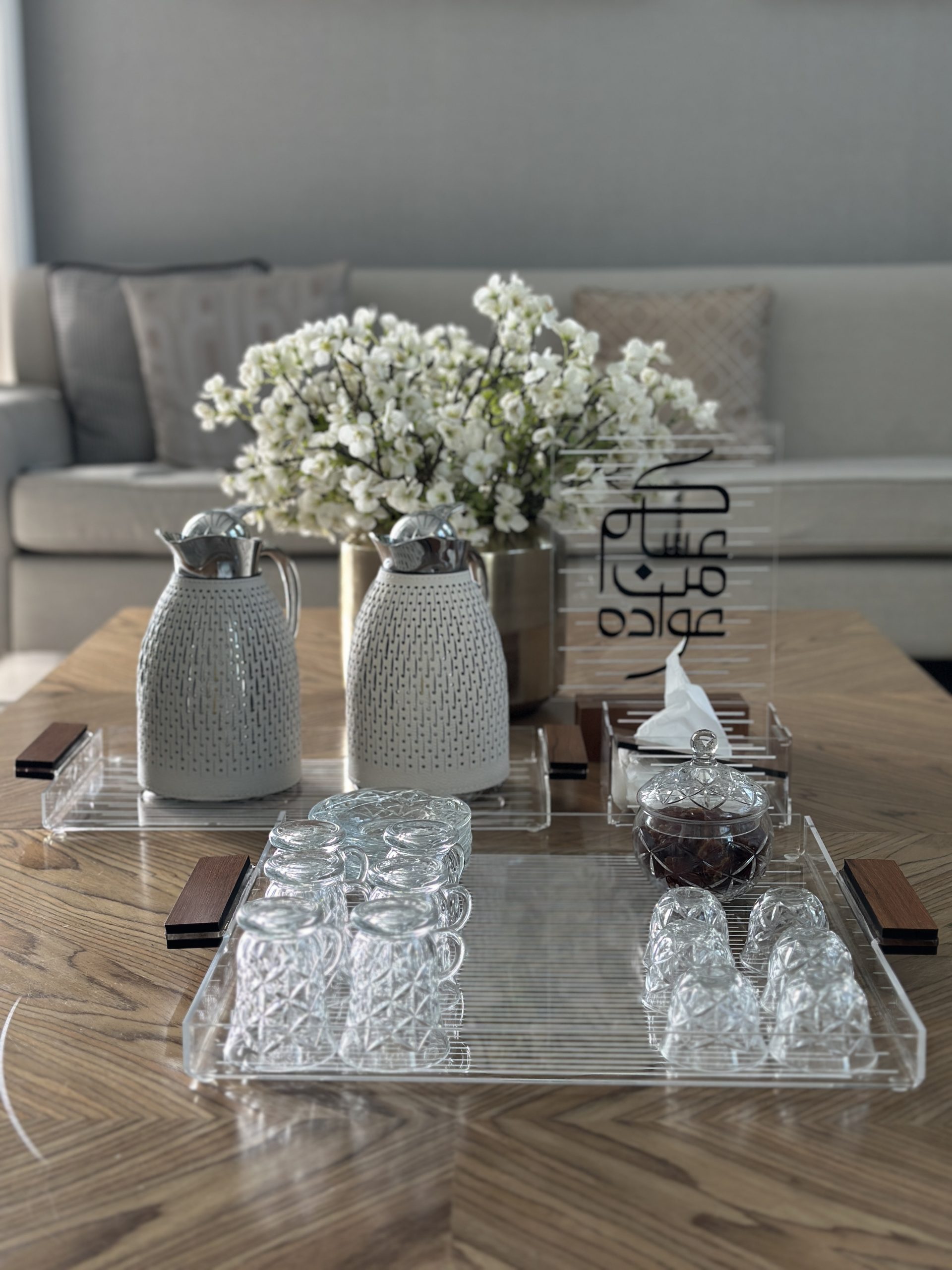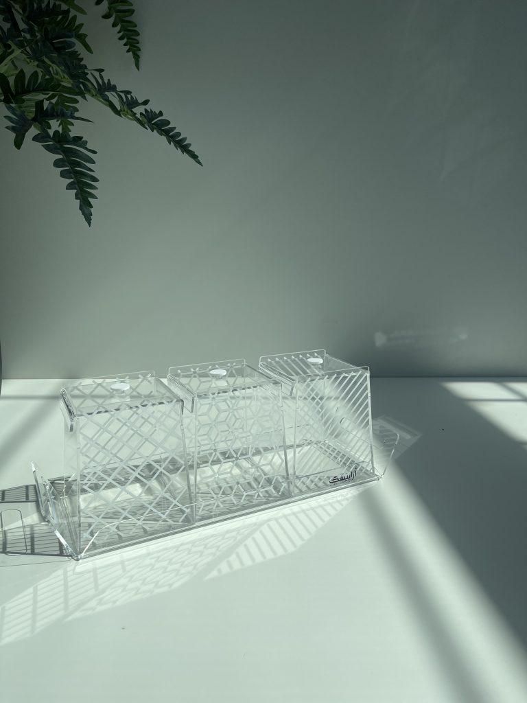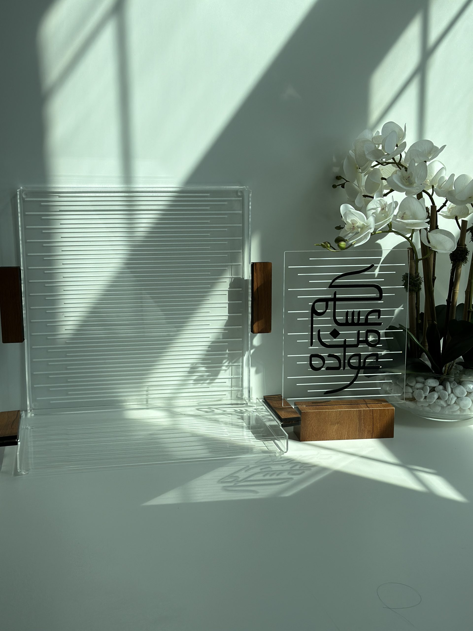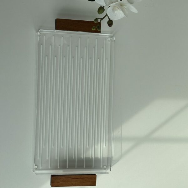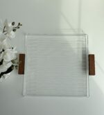 Eid tray with a an acrylic base, wood handle and design with lines. Size: 40x40cm