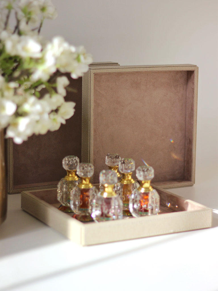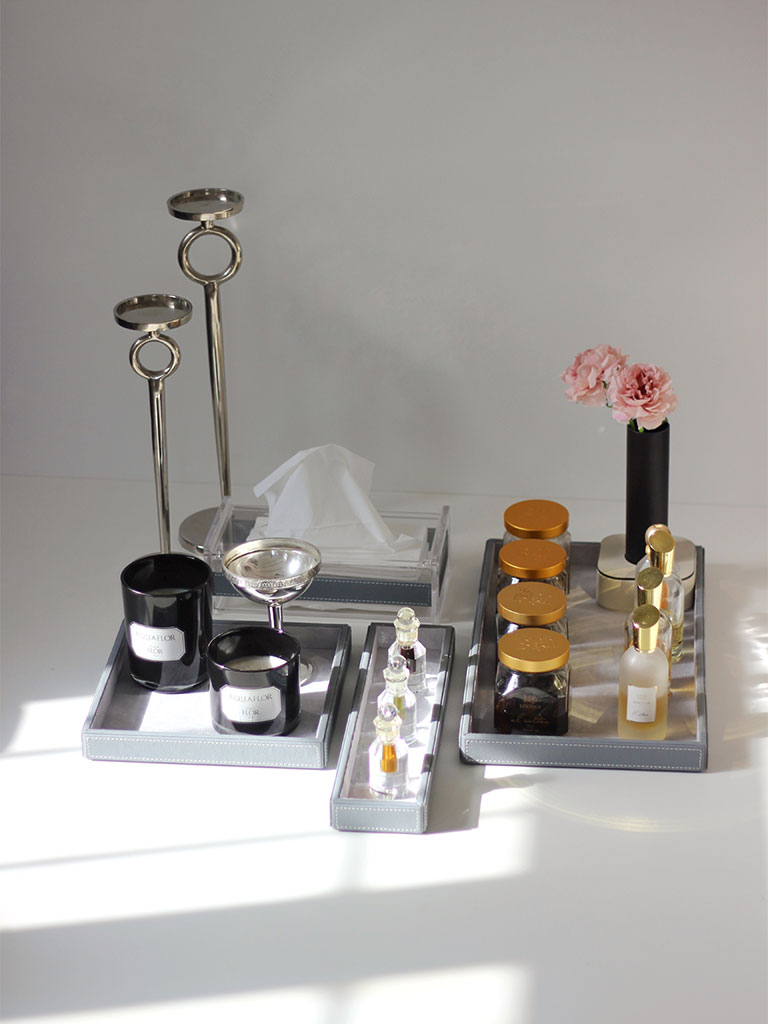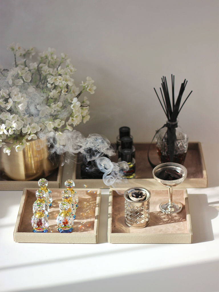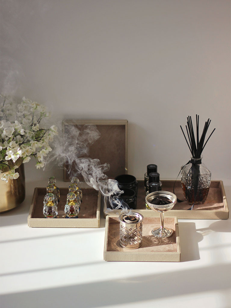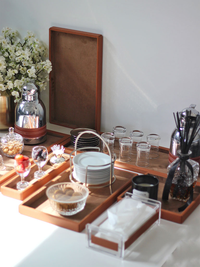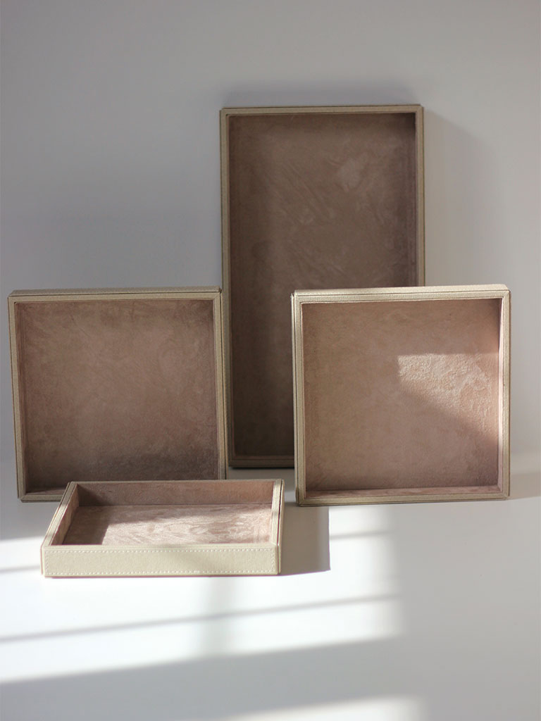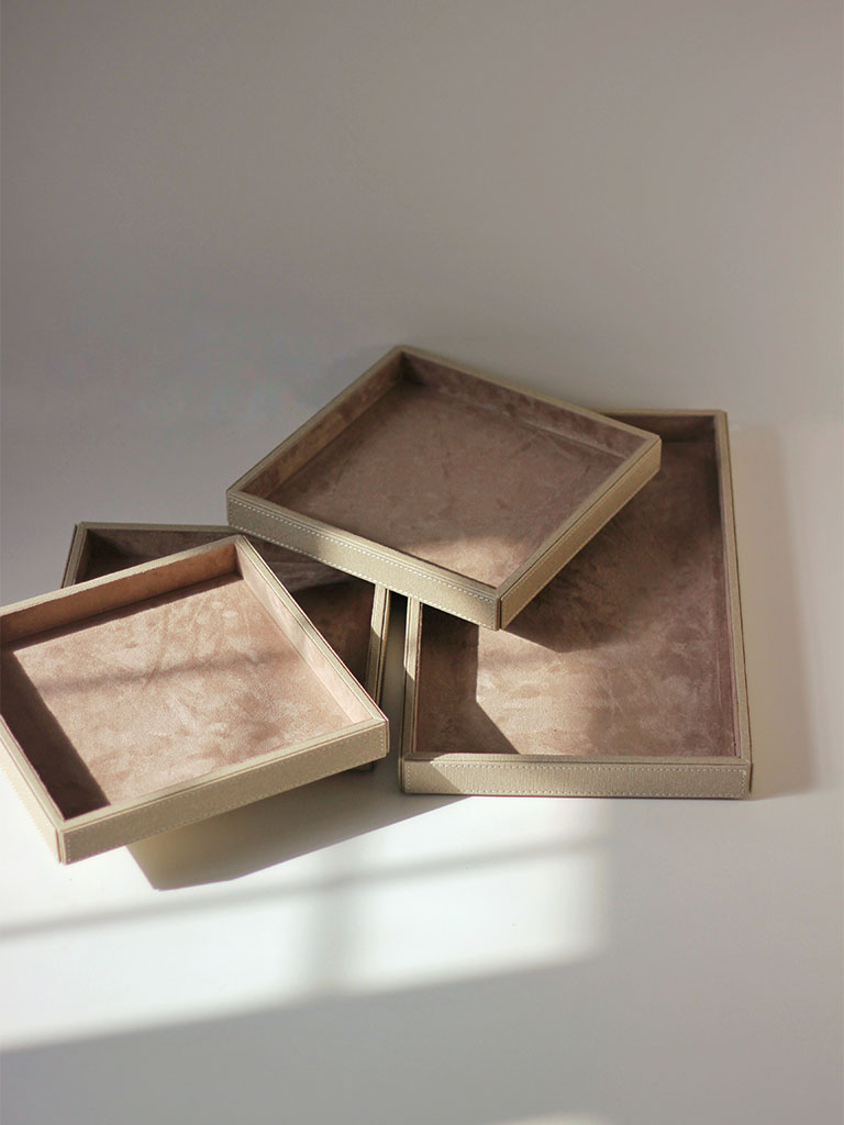 There are 3 square trays (25x25cm) and 1 rectangle tray (45x25cm) which is meticulously wrapped in luxurious, high-quality leather, creating a smooth and polished surface that not only serves as a stunning visual focal point but also adds a tactile dimension to your space.(Many other colors available)