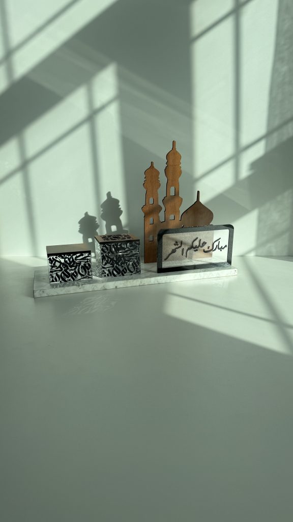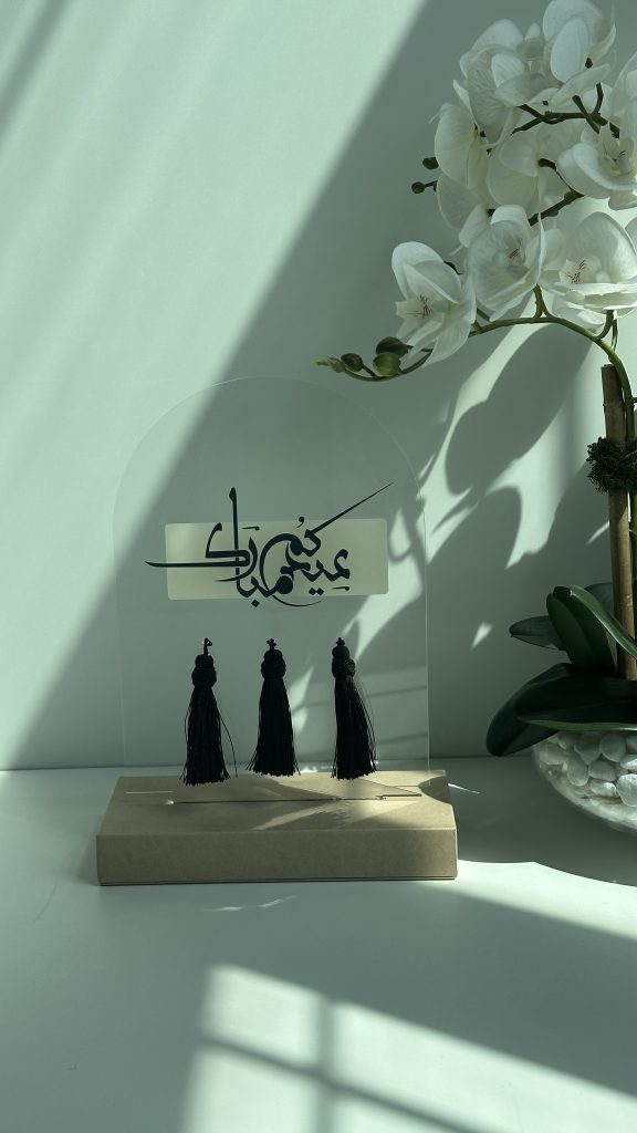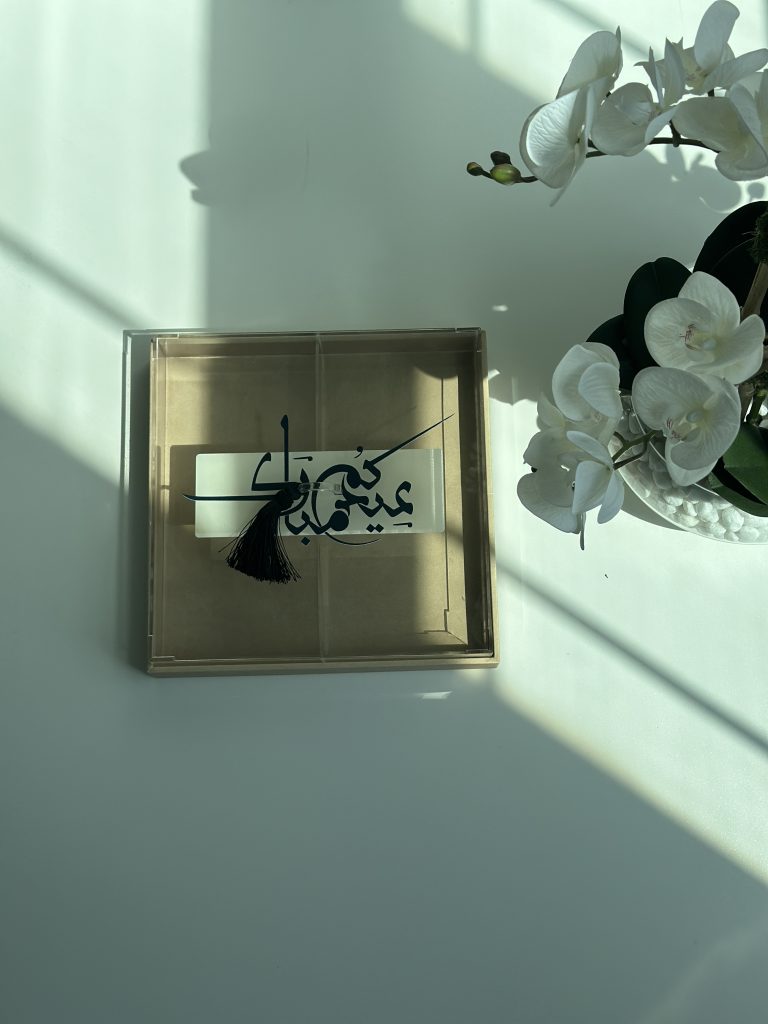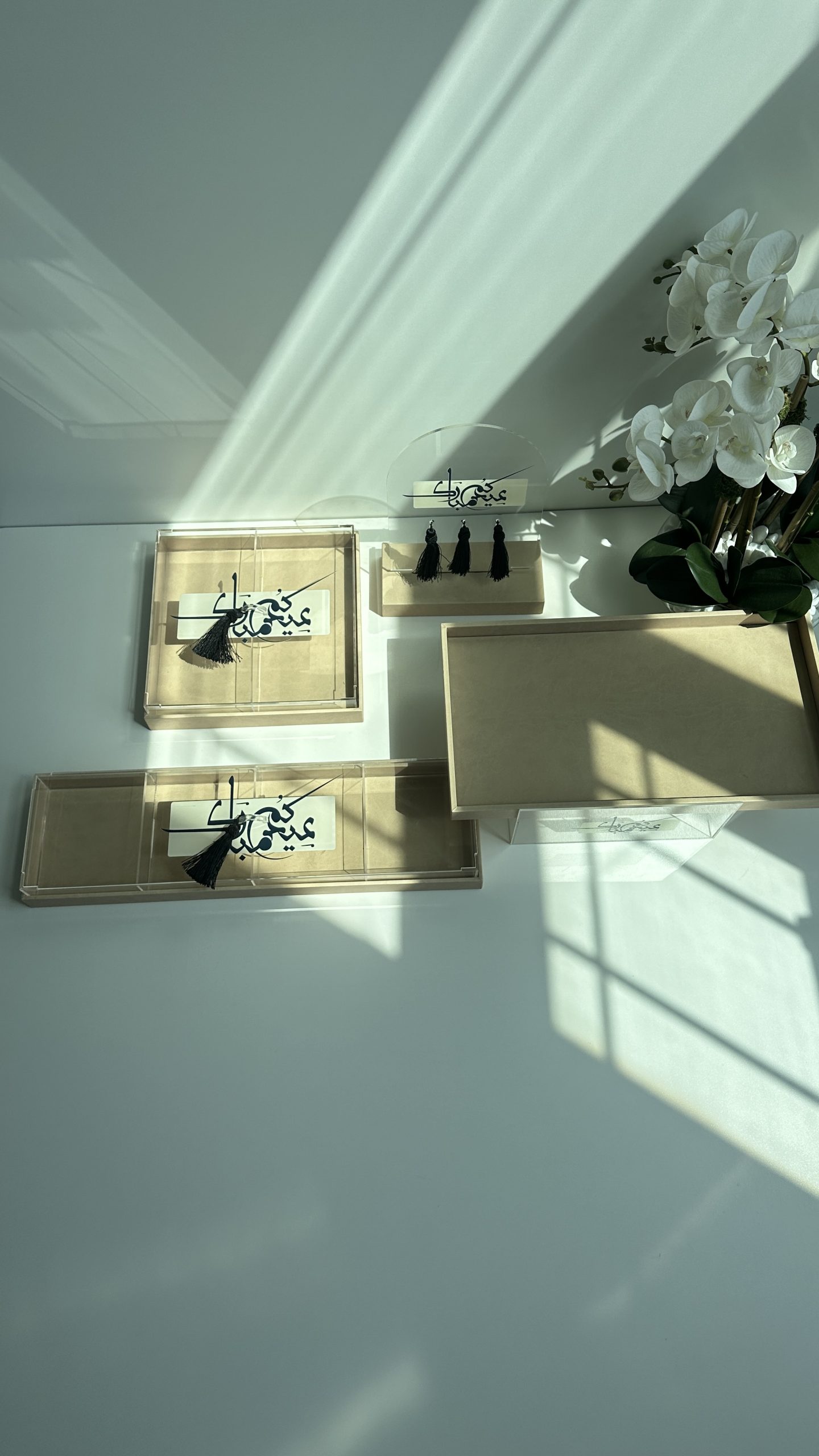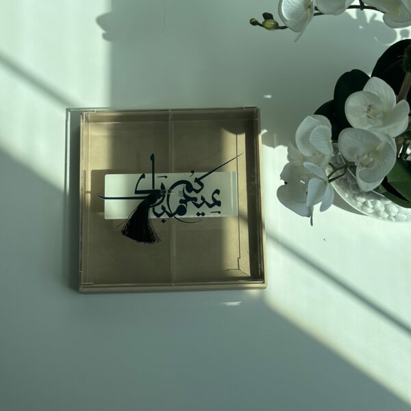 Eid Sweet box in the long design comes with a leather base and a cover with an eid print and tarbosh. Size:54x15cm