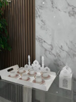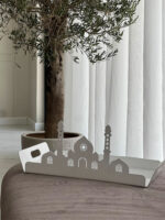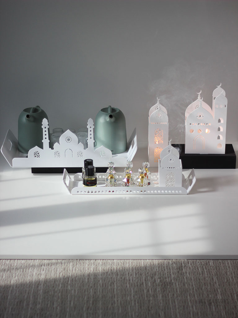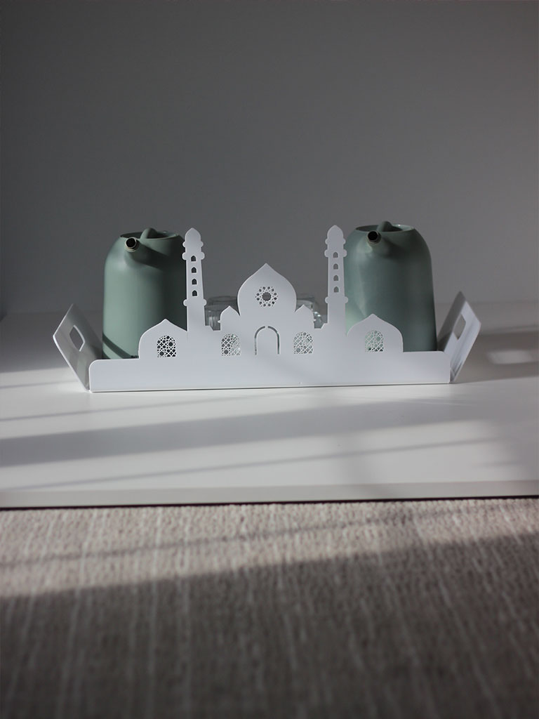 A pristine and elegant piece that blends modern aesthetics with cultural richness, featuring a generous size of 52x32cm. Crafted with meticulous attention to detail, this tray becomes a symbolic canvas for your gatherings during special occasions. The clean and contemporary design of the acrylic tray, adorned with a delicate white masjid silhouette, adds a touch of sophistication to your tabletop.
