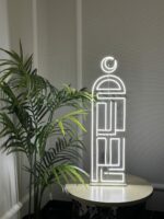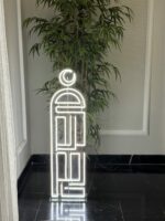 A Ramadan Kareem light stand features intricate designs, the stand emits a warm, inviting glow, creating a serene ambiance during the holy month. Crafted with attention to detail, it serves as a meaningful decoration, symbolizing the spirit of Ramadan.