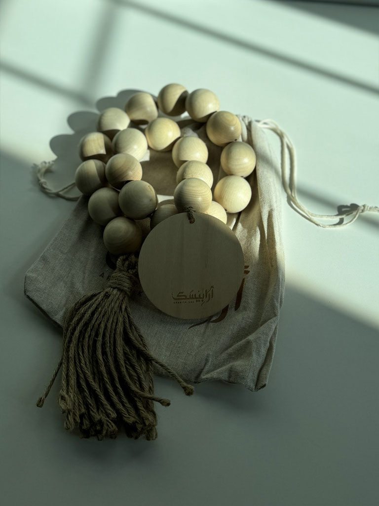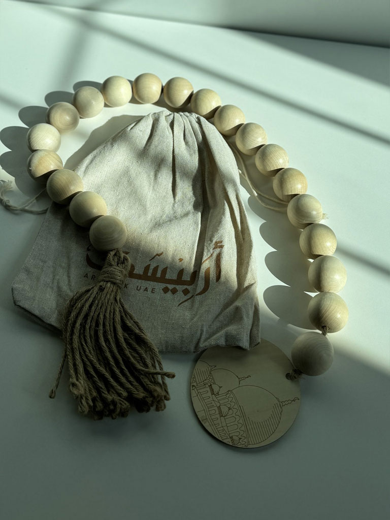 Exquisite wood mesbah crafted with precision, featuring a finely detailed design that adds a touch of sophistication to your spiritual practices. The warm and natural tones of the wood create a serene atmosphere, compact and intricately carved, this mesbah is a beautiful blend of functionality and aesthetic appeal.